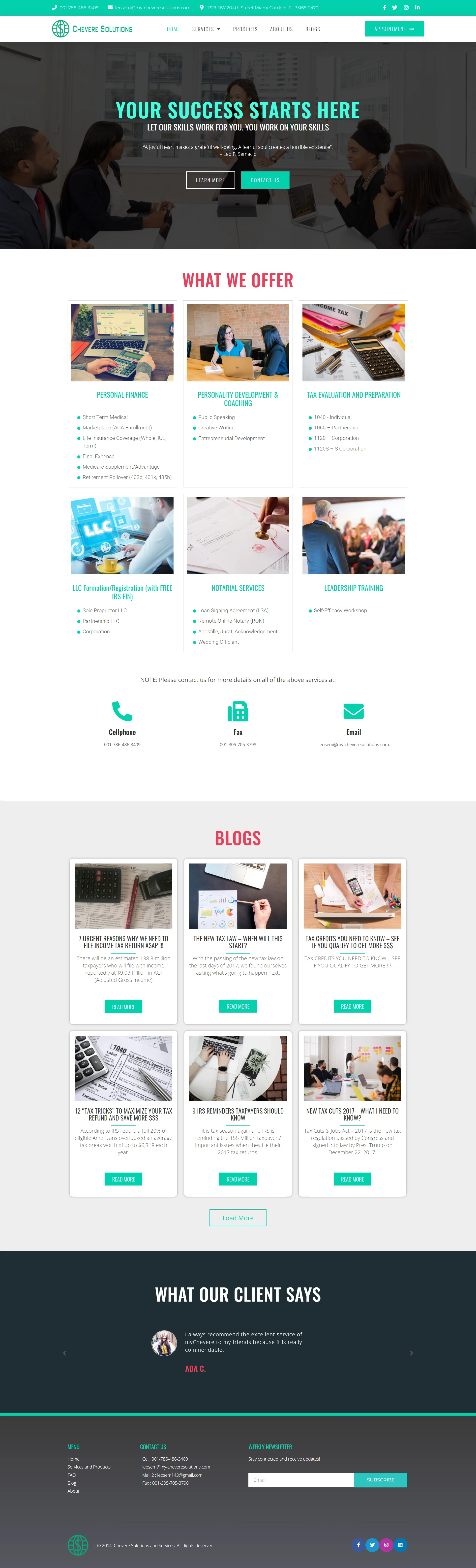 This project involved developing a professional business website for Chevere Solutions to present their financial, tax preparation, and consulting services in a clear and organized structure. The website was designed to highlight multiple service offerings including personal finance support, tax evaluation and preparation, LLC formation, notarial services, and leadership training. A structured layout and clear navigation help visitors easily understand the services and take action to contact the business. The result is a professional online platform that strengthens credibility while supporting client inquiries and service discovery.